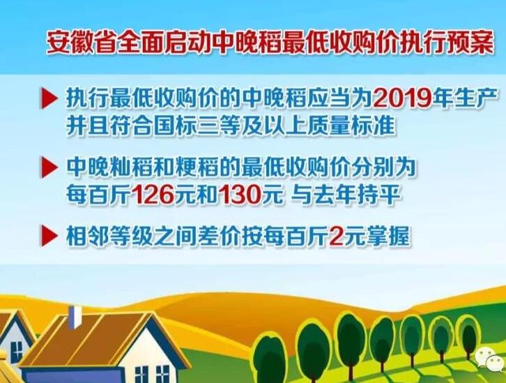 ??? 近日,從省政府新聞辦舉行的新聞發(fā)布會(huì)上了解到,從現(xiàn)在開始到2020年1月31號(hào),安徽省全面啟動(dòng)中晚稻最低收購價(jià)執(zhí)行預(yù)案,執(zhí)行最低收購價(jià)的中晚稻應(yīng)當(dāng)為2019年生產(chǎn)并且符合國標(biāo)三等及以上質(zhì)量標(biāo)準(zhǔn),中晚秈稻和粳稻的最低收購價(jià)分別為每百斤126元和130元,與去年持平,相鄰等級(jí)之間差價(jià)按每百斤2元掌握。
